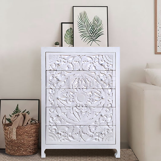 Wooden carved 5-drawer dresser 'Calyta' - White