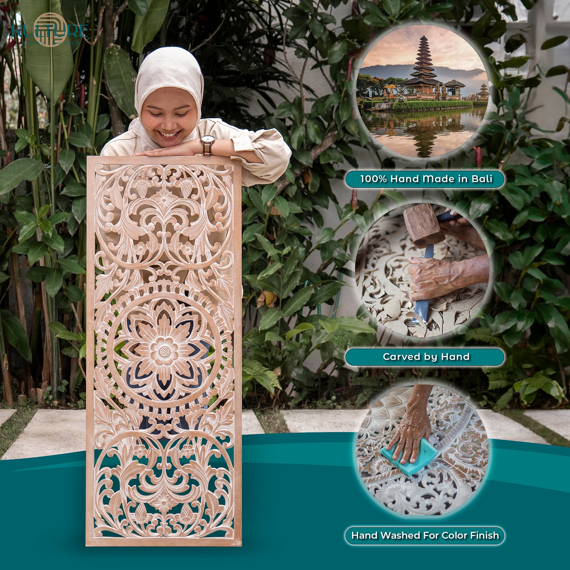 Each piece is meticulously handcarved from scratch by skilled Balinese artisans, using ancient wood-carving techniques passed down through generations.