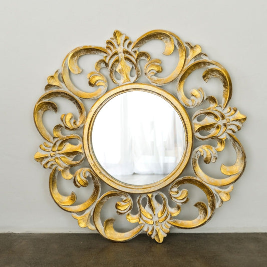 Hand Carved Mirror "Roopa" in Gold Antic Wash - 80 cm