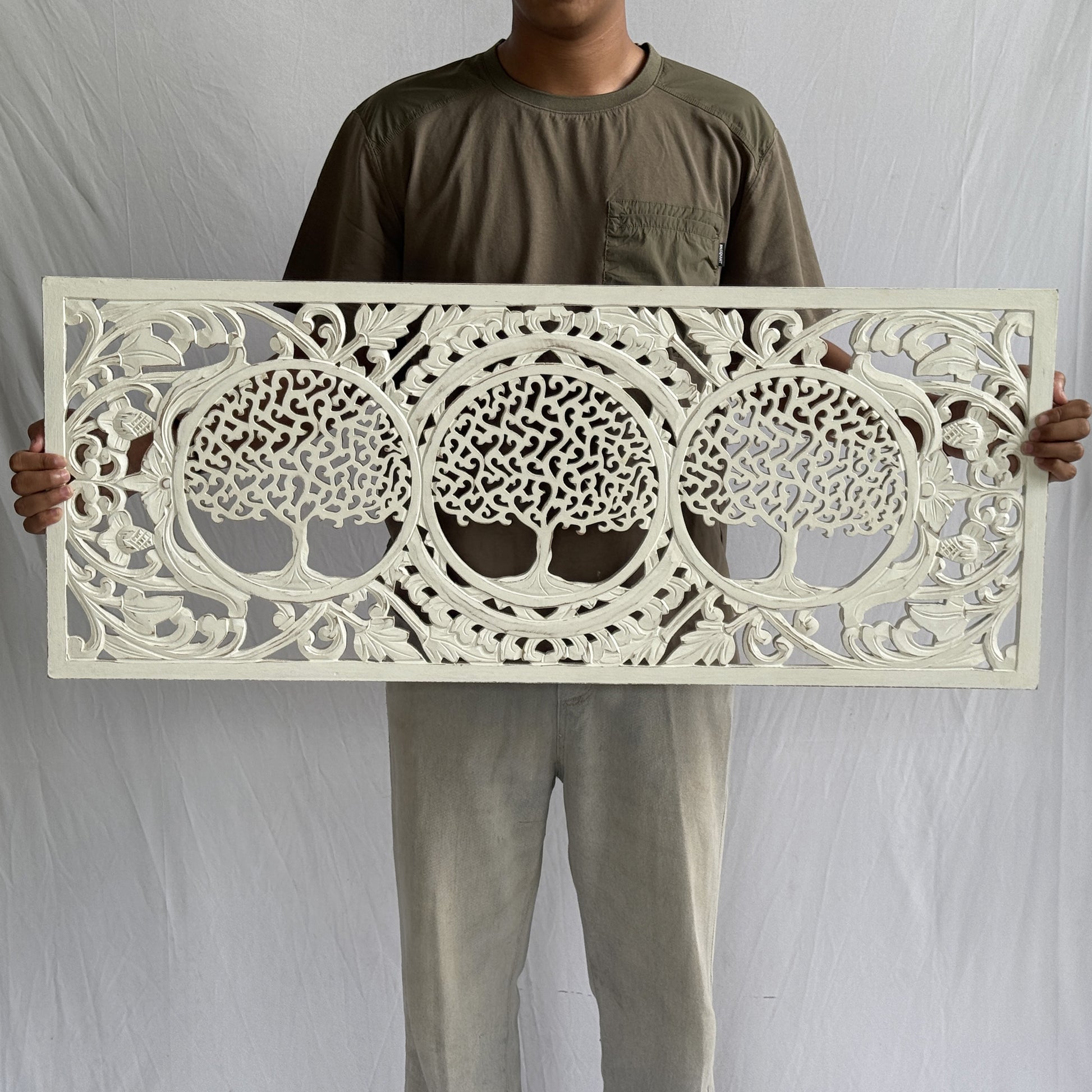 Bring a touch of elegance and natural beauty to your space with this horizontal wall art featuring three Trees of Life in a row. Crafted with care, it measures 100 cm in width and 40 cm in height, making it a perfect centerpiece for your living room, bedroom, or office. Finished in a white wash color, this piece adds a soft, serene aesthetic that complements a variety of interior styles.