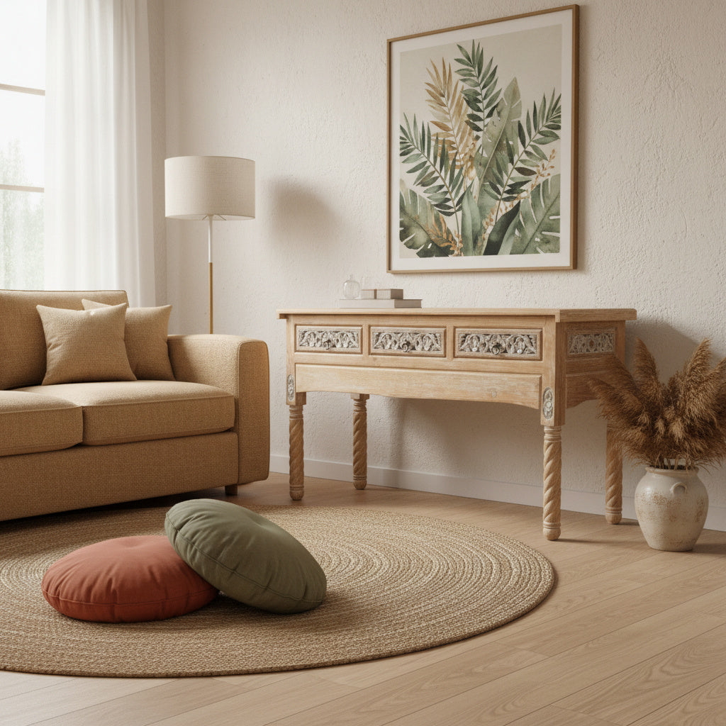 The detailed carved apron and drawer panels showcase artisan workmanship, while the natural wood finish brings depth and texture. Three functional drawers provide practical storage for keys, mail, or everyday essentials, making it perfect for entryways, hallways, or living spaces.