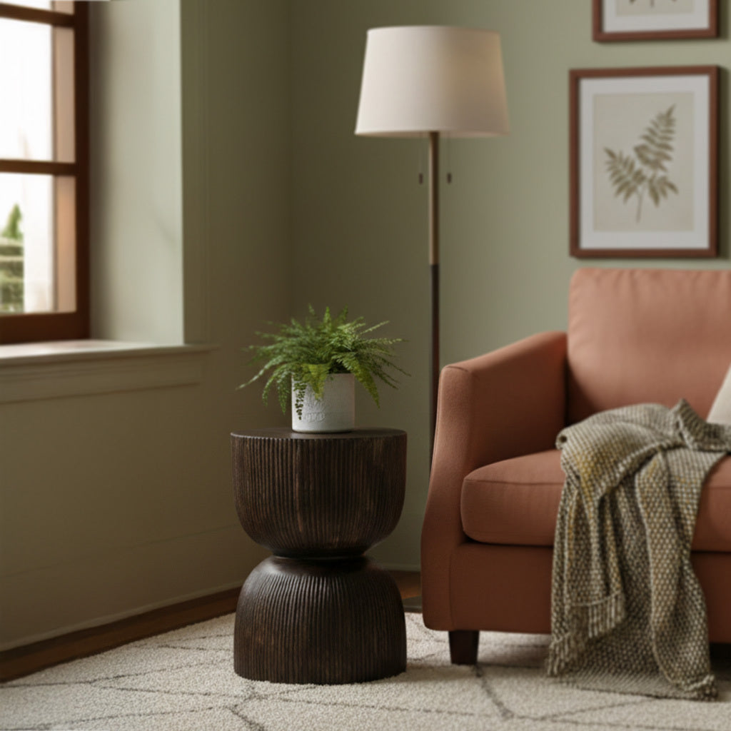 Measuring 40 cm in diameter and 50 cm in height, Samara works beautifully as a side table, bedside table, or occasional stool. Its rounded body and carved vertical details create a soft rhythm of light and shadow, highlighting the natural wood grain that makes every piece unique.
